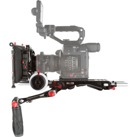 The kit includes a Canon C200 Baseplate with a shoulder mount, a 15mm Rod System, an Adapter Plate, a pair of Telescopic Handles with Push-Button Technology, a Follow Focus Pro, and a Shape Matte Box 4x5.6".