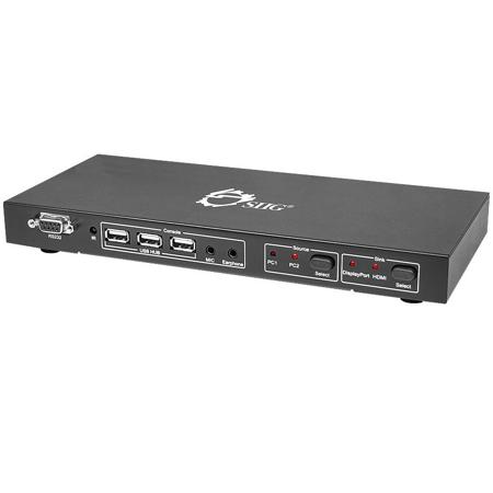 The SIIG 2x1 USB DisplayPort KVM Switch with Remote Control easily allows you to share an HDTV or display, USB keyboard and USB mouse with microphone between two USB/DisplayPortTM computers. It supports HDMI resolutions of up to 1920x1080 or DisplayPort resolutions up to 2560x1600. The DisplayPort KVM switch features a metal housing for excellent RF shielding and convenient front push buttons or remote control for convenient device switching.