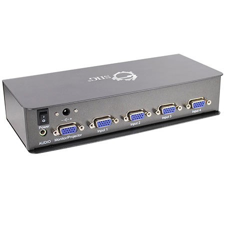 The SIIG 4x1 VGA and Audio Switch with IR allows you to switch between four computers to share a VGA monitor and a set of speakers. It supports up to 1920 x 1440 resolution, VGA, SVGA, XGA, UXGA and multi-sync monitors, analog stereo audio (via 3.5mm audio jacks) and video bandwidth of up to 300 MHz with operating distance up to 50M (164 ft). The 4x1 VGA & Audio Switch with IR features metal housing to ensure the most durable and reliable setup and efficient heat dissipation for long life. It is a user-friendly device enabling you to switch between multiple computers via the front-panel buttons or IR remote control.