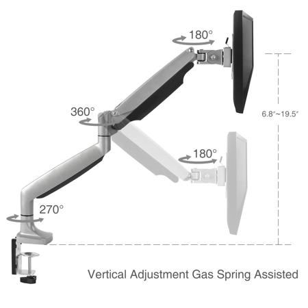 Premium quality durable gas spring assisted full-motion desktop mount provides smooth, precise and effortless viewing height adjustment