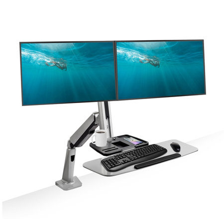Gas spring assisted full-motion adjustable (tilt, swivel, rotate and height) dual monitor and laptop tray desk mount allows you to work in either a standing or sitting position.