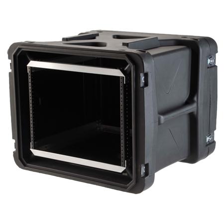 The SKB R908U20 8U Roto Shock Rack feature a 20" deep rack frame installed in a roto molded tough shell with an integrally molded valance that eliminates the metal valance on the outside of the case, coupled with a rubber gasket on both the front and rear doors for water resistant protection. The integrated molded valance, ergonomic handles and recessed, heavy-duty twist latches allow these cases to meet most ATA and military specifications.