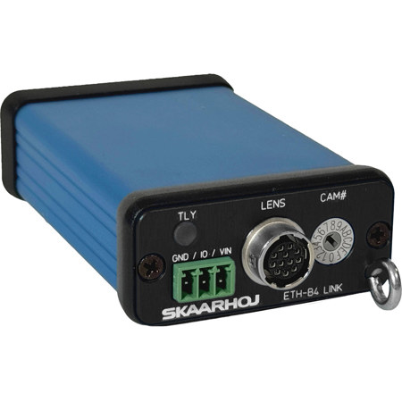 The ETH-B4 Link facilitates network connection for analog B4 broadcast lenses with a Hirose-12 connector, providing lens control via Ethernet. Utilizing SKAARHOJ's device cores, operators can precisely manage the iris of B4 lenses and access a dedicated tally channel. This device stands out with its incredibly light and compact form, offering a unique solution where iris control data is transmitted separately from camera control signals. Features include a camera selector switch for ID and IP configuration, analog output via Hirose-12 connector, and a dual-color tally lamp, along with a relay output for program tally signals, ensuring a comprehensive control experience.