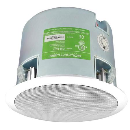 The CM-EZ-II is a two-way, blind-mount, in-ceiling speaker. The CM-EZ-II speaker design incorporates an 8" polypropylene driver with rubber surround and a 7.3 liter steel backcan for extended frequency response (54 Hz - 22 kHz, - 10 dB). SoundTube's integrated CM-EZ-II design includes unique and patented blind-mount Snap Cam installation technology and a 21-gauge steel tile bridge ensuring rapid and secure installation in any drop-tile ceiling. For easy ordering, stocking and installation, the CM-EZ-II comes with a six-position tap switch for 25-, 70.7- and 100-volt modes with transformer bypass position position.