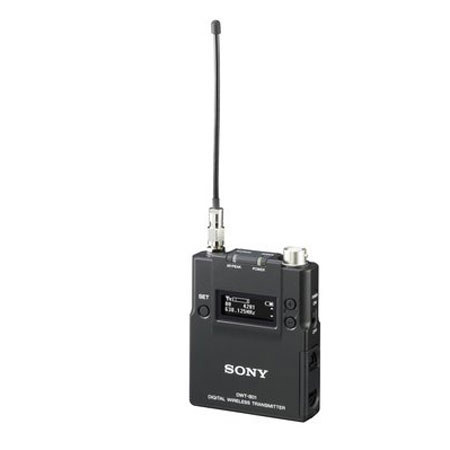 The Sony DWT-B01 digital body-pack transmitter is compact, lightweight and built with a sturdy die-cast magnesium body. The E3040 model operates within a 66 MHz range, from 566 to 608 MHz and from 614 to 638 MHz. Audio input is selectable from either mic or line level. The DWT-B01 provides a choice of 1, 10 or 50 mW RF output. The transmitter operates for approximately 5 hours using two AA size alkaline batteries at 10 mW output power.