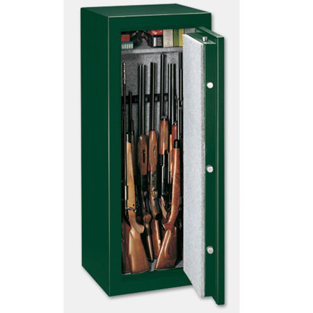 The Stack-On 16 Gun Safe with Combination Lock (Matte Hunter Green) is fire resistant up to 1400 for 30 minutes to protect important papers and other valuables and has a fully convertible interior that can accommodate from all guns to all shelves. Quality features include massive 1-1/2 in. live action locking bolts, a 3-spoke steel handle and deluxe interior. The exterior has a Matte Hunter Green finish with chrome accents.