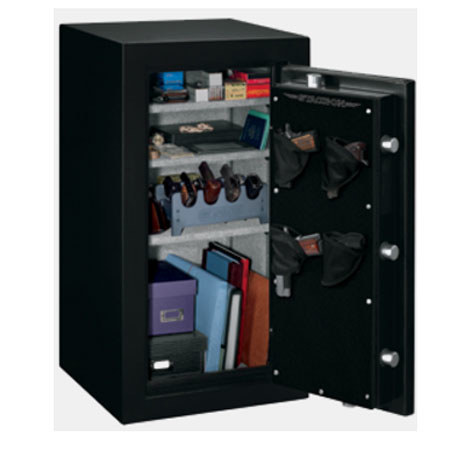 The Stack-On Shooter's Fire-Resistant Pistol & Ammo Safe offers 5.7 cubic feet of interior storage with three adjustable shelves and a factory-installed door storage system that holds four pistols for quick access. Approved as meeting the California Department of Justice standards for firearm safety, this safe features a four-way locking system using a total of eight locking points - five 1.5" live action locking bolts and three deadbolts. The live action locking bolts are extended and retracting by turning the three spoke steel handle. The electronic lock is easy to program with a three to eight digit code, batteries are accessible from the front of the lock and a backup key is included.