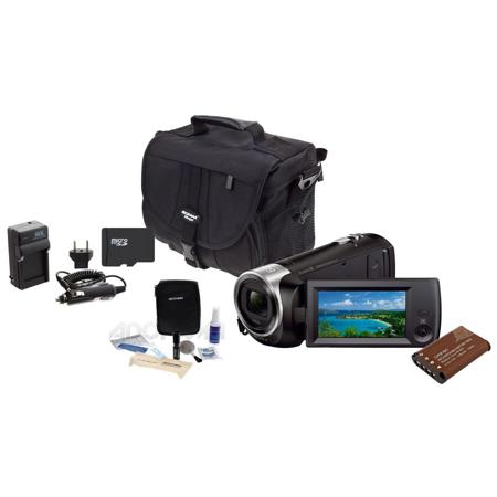 The bundle includes a Sony HDR-CX405 Full HD 60p Camcorder, a 32GB Class 10 MicroSDHC Card, a durable Video Case, a Spare Battery, an AC/DC Battery Charger, and a Cleaning Kit.