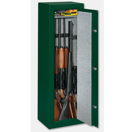 The Stack-On 8-Gun Security Safe with Combination Lock holds 8 rifles or shotguns up to 52" tall. It is available in hunter green matte paint finish. It features 3-number combination lock with a drill resistant, hardened steel plate behind the lock that provides greater security.