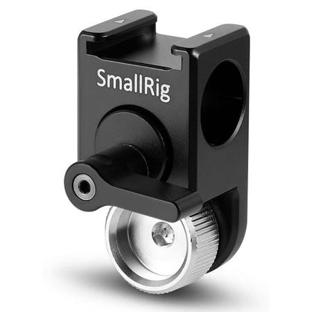 The integrated cold shoe could attach Magic Arm 1497 and then monitor, or it could attach microphone directly. The pressing piece which works together with the wingnut helps to lock 15mm rod tighter. It is equipped with a 3/8" screw to be mounted on the top plate, cage and handle with 3/8" threaded hole. The rod clamp is utilized to lock 15mm rod and then Safety NATO Rail with 15mm Rod Clamp 1856 and EVF Mount 1594 for monitor.