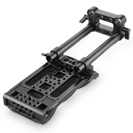 This shoulder rig kit is compatible with both big and small cameras. It bridges the camera and the Shoulder Pad 2077, and offers another 15mm rod rail system to attach external batteries and counterbalance weight at the back.