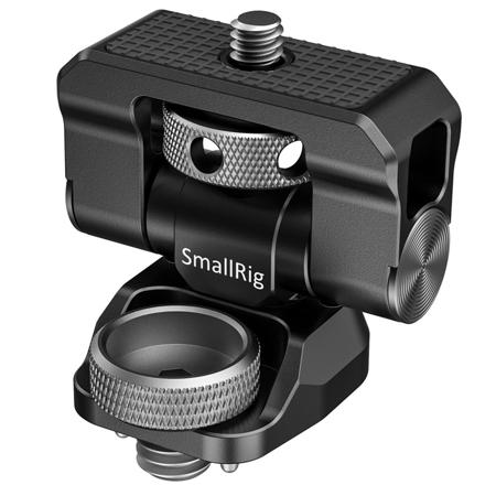 SmallRig Swivel and Tilt Monitor Mount with Arri Locating Pins BSE2348 is designed to hold your monitor onto the camera cage or other mounting system features arri 3/8"locating hole. It features arri 3/8"locating pins on the bottom and 1/4"-20 screw on the top for monitor, light or microphone. The holder enables to swivel 360deg. sideways and tilt 170deg. which allows to hold your monitor onto any position without using tools. The robust mount is CNC-Machined Aluminum and can support 5"and 7"monitor up to 1.2kg, for vertical (90deg.) payload, it can hold accessories up to 2.5kg. The top features rubber pad to protect your monitor and light from scratching. The thumbscrew features holes for hex spanner to secure it tight and ensure your monitor safe.