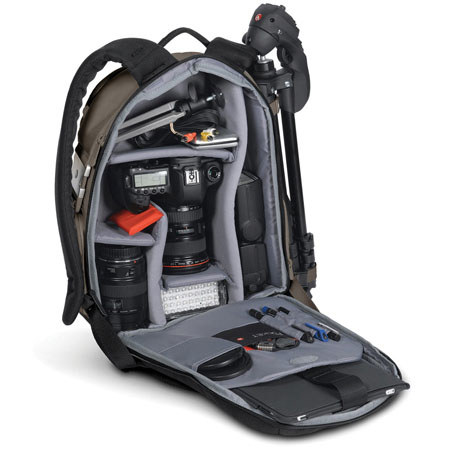 The Manfrotto MB SB390-3 Veloce III (bungee cord) is the essential shooting backpack, which comfortably fits all your camera gear and tripod either inside or outside the bag as well as a 13" laptop (13" Apple). Grab your DSLR (with or without battery grip and up to 16-35 mm lens attached) via the top opening without having to open the entire bag. The 1-2 additional lenses, flash and accessories fit in the bottom compartment.