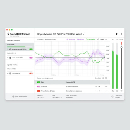Unify all of your monitoring devices under the same reference sound and switch seamlessly between your speakers and headphones. With this upgrade you will add speaker calibration in addition to an already existing set of features offered by SoundID Reference for Headphones. As a result you will hear every detail across the frequency response spectrum and will trust every mixing decision you make.
