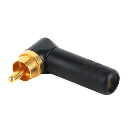 The Switchcraft Right Angle Cable Mount RCA Plug features an easy-to-assemble three piece construction: a handle, insulator and plug assembly. The plug features a solid-pin design and large solder terminals that make termination faster and easier. The reduced profile makes it perfect for use behind equipment where space is at a premium. The larger cable clamp and handle will accommodate a variety of cable sizes. Gold plated plug with black finish handle, it will save time and space in any application.