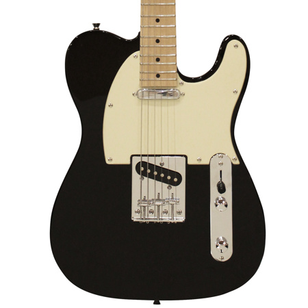 The Sawtooth ET Series Electric Guitar features a sleek black finish with an aged white pickguard, giving it a stylish, vintage vibe.