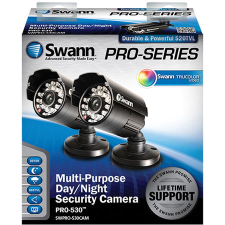The Swann PRO-530 Multi-Purpose Day/Night Security Camera (IR Cut Filter, 2 Pack) features a 1/3" SwannTruColor (STC) video sensor and a 4.8mm lens with a 58deg. viewing angle, delivers clear and crisp footage at 600 TVL with a wide viewing angle.