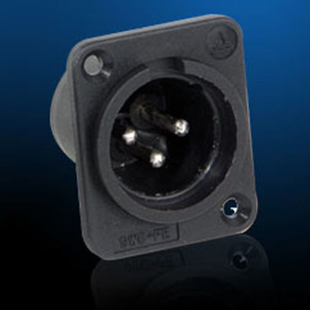 The Switchcraft Plastic Panel Gold Mount (0.126") is a 3pin Male xlr front mount connector using 94V-0 rated material