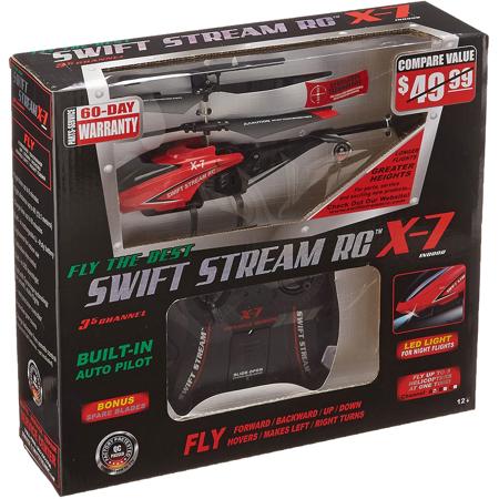 Swift Stream RC 9.4 inch X-7 Helicopter flies forward and backward, up and down, makes left and right turns. Fly up to 3 helicopters at a time! Flight time up to 8 minutes. Flight distance up to 40'. Built in LED search light. Built in Auto Pilot.
