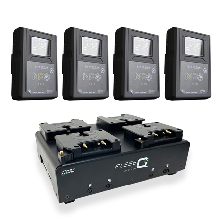 The bundle includes a Core SWX FLEET-Q4A 3A 4-Position Charger, which allows for efficient charging of multiple batteries.