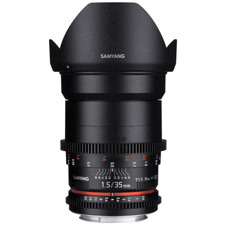 The Samyang 35mm T1.5 Cine AS UMC Lens for Canon EF was developed primarily for film and video applications. The cine version of Samyang's 35mm lens features industry-standard gearing for the focus and aperture ring, and the aperture ring has been de-clicked for smooth iris pulls. The aperture and focus scales have also been relocated to the side of the lens, where it is easier for focus pullers to read them.