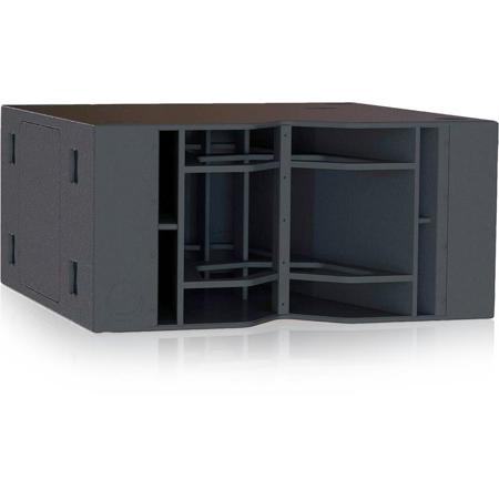 The FLASHLINE TFS-900B is a 6,400 Watt subwoofer designed for touring and fixed installation applications. It consists of two carbon fiber loaded 18" neodymium low frequency drivers utilizing specialized voice coils wound on both the inside and the outside of the former for higher magnetic density, which results in better cooling, higher power handling and improved efficiency. These high power drivers are mounted in a hybrid horn-loaded enclosure which makes use of output from the rear of the cones as well as the front, providing exceptionally high output at sub-bass frequencies. The TFS-900B is designed for ground stacking with the FLASHLINE TFS-900H flown line array.