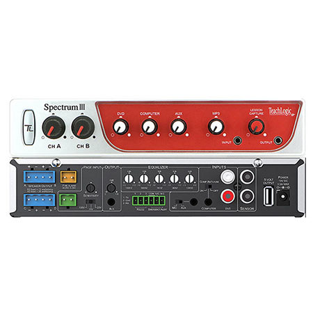 The IRS-8150 Spectrum III Infrared Wireless Classroom Microphone System from TeachLogic is a digital hybrid sound-field system for use in the classroom. This system comprises the IMA-820 Spectrum III Amplifier/Receiver Base Station, IRT-60 Sapphire Microphone/Transmitter with lithium-ion battery for voice transmission, ICS-55 Ceiling Sensor for IR connectivity throughout the room, and four SP-628L Lay-In Ceiling Speakers
