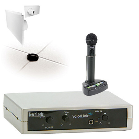 The TeachLogic LS2 VoiceLink Plus Handheld System consists of an infrared wireless microphone receiver, a handheld infrared transmitter microphone, 2 lay-in panel speakers and a ceiling sensor. VoiceLink Plus systems are designed to reinforce the teacher's voice and amplify media sources in classrooms. The IMA-100 wireless microphone receiver features a 20W amplifier, which powers the two SP-628L lay-in panel speakers. TeachLogic's IRH-35 infrared transmitter/microphone transmits the presenter's voice while granting freedom of movement throughout the classroom via the ICS-55 infrared dome sensor receiver. A Duracell NiMH battery and a drop-in battery charger for the microphone are provided. Connection to a computer DVD or iPod is facilitated by an auxiliary input on the receiver's front panel.