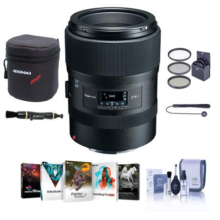 The bundle with the Tokina atx-i 100mm F2.8 FF MACRO lens includes a ProOptic 55mm filter kit, lens case, lens cleaner, lens cap tether, cleaning kit, and PC software kit.