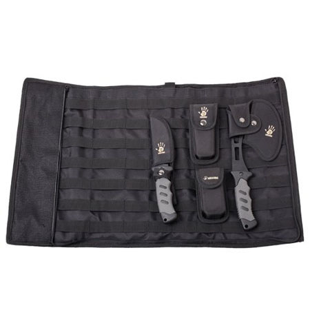 The 12 Survivors Knife Rollup Kit offers basic tools for surviving the outdoors. Including a fixed blade knife, folding knife, a hand axe and a multi-tool, the 12 Survivors Knife Rollup Kit provides you with the tool for any situation you may find yourself in while outdoors. With snap button straps, the kit easily attaches to the exterior of existing gear freeing up space in your pack and offering you unimpeded access to your tools and bag. Constructed from durable and weather resistant nylon material, the 12 Survivors Knife Rollup Kit is designed to survive the dynamic environments you enjoy.