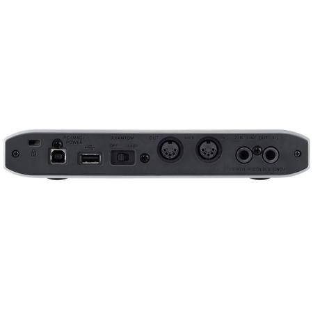 The body is made of a single piece of thick rolled aluminum which is resistant to external impacts. Recessing the jacks on the back creates a flat design without protuberances. The knobs and other items on the front are protected by left and right guards. Outstanding portability has been achieved compared to conventional box-shaped desktop audio interfaces.