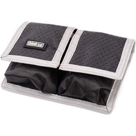 The Think Tank Photo Pro DSLR Battery Holder (Black with Gray Interior) holds two pro-size DSLR batteries in two separate pockets. The ballistic nylon holder folds in half for easy storage within your gear bag and will also fold flat when empty.