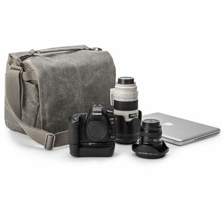 The Think Tank Photo Retrospective 40 Shoulder Bag (Pinestone) is a soft-sided camera bag with a simple design on the outside and a lot of storage capacity on the inside. It is capable of carrying up to two full-frame DSLRs plus three to six lenses, with dedicated slot for most 15" laptops.