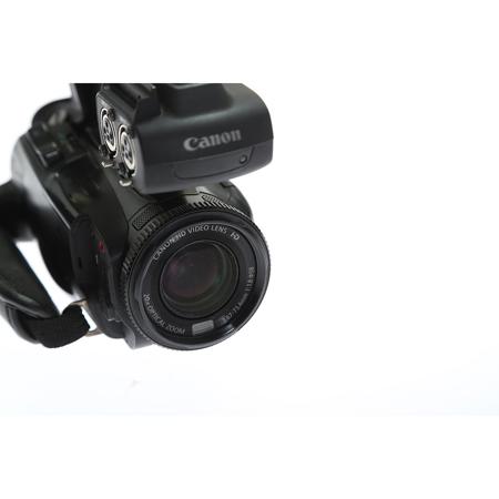 The XA30 Professional Camcorder features a Genuine Canon 20x HD Zoom Lens that provides a highly versatile zoom range with 35mm equivalent of 26.8-576mm, and a minimum object distance of just 23.6 inches (60cm) to help capture powerful recordings near and far. The impressive image quality is enhanced by an 8-blade Circular Aperture design, which helps to avoid the ''starburst'' effect of point light sources in non-circular aperture designs. Out-of-focus areas are smooth, natural and appealing. An endless-type focus and zoom control includes user-programmable direction and sensitivity modes. Zoom speed can be set to either a variable or constant (with 16 levels) speed setting, with Fast, Normal, or Slow zoom speed levels.