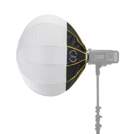 Illuminating open spaces without evidence of light source is a real challenge that the Glow 25" Quick Ball Lantern Softbox solves handily. All parts of the orb emanate equal amounts of light, as the Chinese latern style globe-shaped softbox has no source focal point, no nasty reflector to gather and direct the scattering ray as they leave a wide-angle flashtube, or better yet, a barebulb flash. The degree of softness the transluscent white fabric of the Quick Ball Lantern creates, exceeds that achieved by rectangular or even polygonal softboxes. Coverage on the horizontal axis is 360 Degree and more than 240 Degree vertically. Setup and breakdown is a breeze, just a matter of minutes before you are ready to roll. The precreated frame assembly snaps into perfect shape, ready tomodify any Bowens mount flash or continuous light. The natural effect makes it ideal for gentle omnidirectional lighting for offices, interiors and meeting rooms. The task of architectural photography is made simple with an arrangement of multiple lanterns,filling the space with even coverage. Even weddings and portraits can benefit from employing the sphere with supplemental fill lighting from an unobtrusive distance.