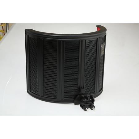 Versatility is at the heart of this isolation filter's design. It features a universal two-piece clamp with swivel capability, allowing for easy mounting on a variety of stand types. The integrated L-shaped bracket, complemented by a 5/8" extension adapter, provides a secure and stable fit for a wide array of microphone models, including ball head, condenser, large diaphragm, small diaphragm, and universal microphones.