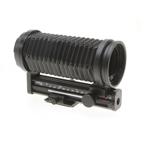 The bellows extension provides variable extension from 63.5 (2.5") to 202 mm (8") with all Hasselblad interchangeable lenses from 50 to 500 mm focal length. The scales on the bellow's rail show the actual extension and the exposure value reduction when used with the Makro-Planar CF135 mm lens. A sliding quick-coupling plate, with tripod threads, makes it possible to move the bellows and camera up to 140 mm (5.5") in relation to the subject, without aFecting the extension setting.