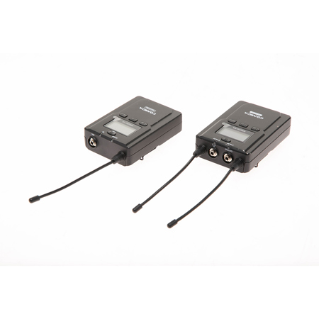 The CVM-WM200A is a dual-transmitter and receiver wireless microphone kit from Comica. This kit runs on AA batteries (not included) and has a maximum range of 120m. To begin using this kit, take out the transmitters and receiver and install 2 AA batteries in each unit. On the transmitters, use the large switch on the side to designate which unit is the A unit and which is the B. Then, you can either assign each a channel manually or use the IR search function to allow the transmitters and receiver to identify which channel has the least amount of interference and automatically assign themselves to that channel. Attach each unit to the user via belt clip, camera cold shoe mount or an accessory arm via the 1/4-20 mount on the back.
