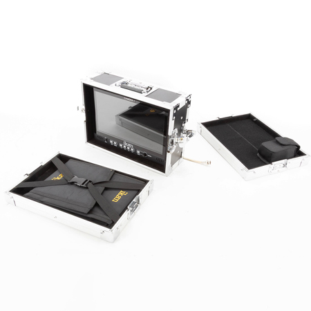 The D12 is integrated directly into the hard case. The hard case features a front door as well as a rear door for quickly accessing all the monitor's functions. The front door also holds the sunhood in place while the rear door holds the AC adapter when not in use.