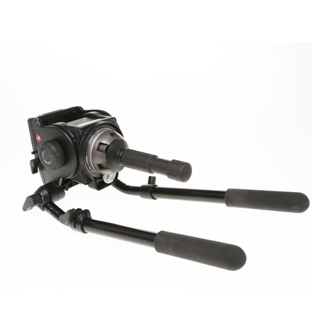 Other features include separate pan and tilt locking mechanism, a fixed counter balance spring of 16.5 lbs load capacity at a center of gravity of 5", two telescopic pan handles, and a bubble level.