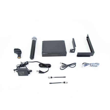 Includes BLX4R rack mount receiver, BLX2/SM58 handheld transmitter, microphone clip, single and dual rackmount kit, two 1/4 wave antennas, zipper bag, power supply, 2 AA batteries, and user guide.