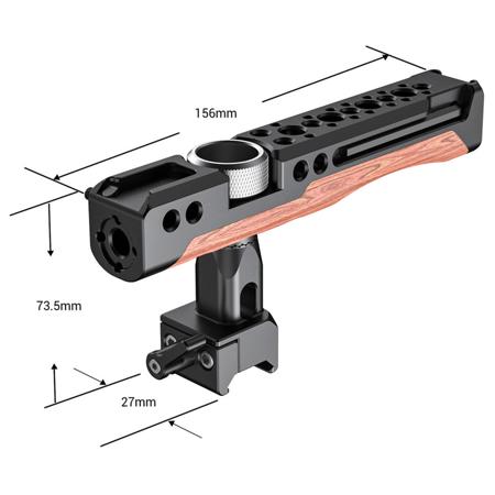 SmallRig Rotating Nato Clamp Handle HTN2362 is designed to provide a comfortable handheld use and mounting threads for accessory such as monitor, microphone and light. The quick release handle is able to rotate 360 degree and secures to any cage with nato rail on the top or side. The handle features multiple 1/4"-20 and arri 3/8"-16 threaded holes for accessory attachment, such as Monitor Mount BSE2294, BSE2348 and Magic Arm 2115. Additionally, it features cold shoe mount for microphone, light or sound receiver, the cold shoe in front features anti-off button to protect your setup from slipping off. The handle integrates with wooden material to make it more comfortable to use.