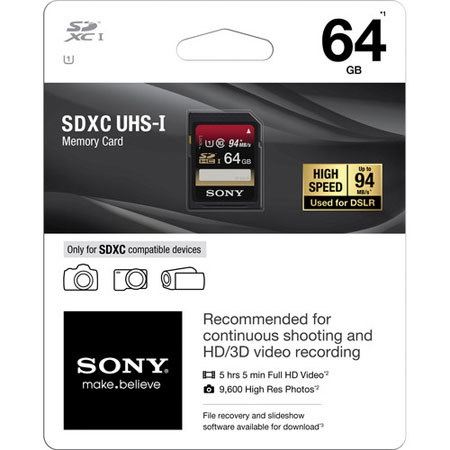 The 64GB SDXC Class 10 UHS-1 Memory Card from Sony features a maximum read speed of 94MB/s and a maximum write speed of 45MB/s with minimum transfer rates of 10MB/s. It is water / dust / x-ray proof, resistant to UV light rays, magnets and static, and capable of withstanding extreme temperatures. Downloadable File Rescue software helps recover photos and videos, including 3D and RAW files, that have been accidentally damaged or deleted.