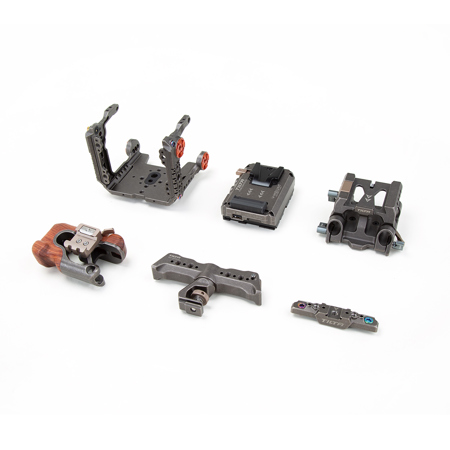 This kit of the RED Komodo camera cage will help to fully build out your setup. It includes: the base RED Komodo cage, right side wooden handle, quick release top handle, Arca and Manfrotto quick release baseplates, 15mm LWS baseplate, an Adjustable Cold Shoe Accessory Mounting Bracket, and finally a Dual Canon BP to V Mount Adapter Battery Plate to allow for a longer battery life for your camera.