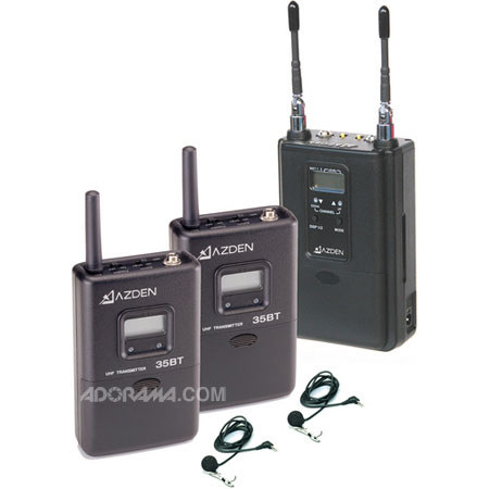 The Azden 330LT UHF On-Camera Dual Bodypack System is a powerful dual-channel UHF wireless microphone system for camera-mount applications. The system consists of two Azden 35BT bodypack transmitters, EX-503 lavalier microphones, and 330UPR portable dual-channel diversity receiver. The inclusion of both bodypacks allow users to operate both microphones simultaneously.