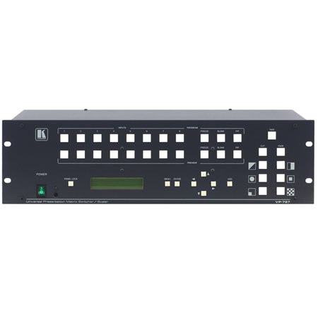 The Kramer VP-727 In-CTRL Dual Scaler Seamless Switcher is a true multi-standard video to graphics scaler and seamless switcher with 8 universal inputs comprised of 5 BNCs, any of which can accommodate a composite video, S-Video (Y/C), component video (RGB/YUV), RGBS, or RGBHV signal. It has dual scalers, one for the preview and the other for the program output. Dual scalers are required to do "live" seamless transitions from one source to another.