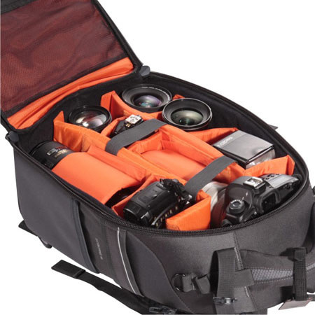 It holds an impressive amount of gear with a fully-opening front. It delivers on the details, too, with generous space to hold gear along with other adventure essentials and it boasts numerous pockets for small accessories. Other features include a detachable padded waist strap for increased security, rain cover, trolley for luggage handles, water bottle and cell phone holders and numerous pockets for lens caps and memory card cases.