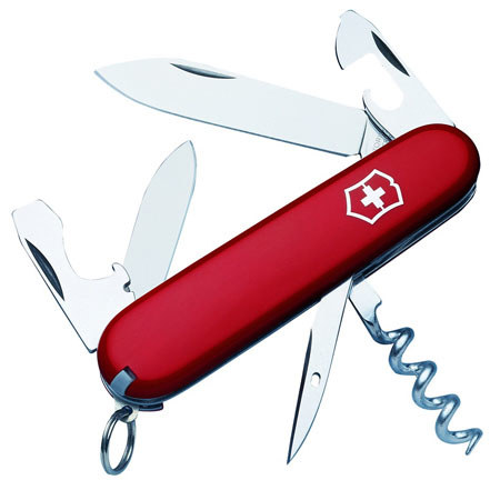 The Victorinox 53131 Tourist Knife (Red) features a large blade, small blade, corkscrew, can opener with small screwdriver (also for Phillips screws), bottler opener with large screwdriver and wire stripper and reamer with sewing eye. The red handle, 3.25" closed, has a toothpick, tweezers and key ring. The Swiss Army knife carries Victorinox famous lifetime warranty against any defects in material and workmanship.