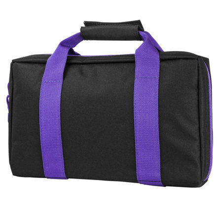The NcSTAR Vism Discreet Black with Purple Trim Pistol Case features 2 separate padded compartments to accommodate 1 full size handgun each. The 6 elastic loops to accommodate up to 6 double stack magazines or 12 single stack magazines. It also features reinforced wrap-around carry handles and heavy duty double zippers.