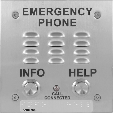 The Viking E-1600-20A ADA Compliant Emergency Phone is designed to provide quick and reliable handsfree communication for any standard analog telephone line or analog phone system station port. The Viking E-1600-20A phone meet ADA requirements for elevator/ emergency telephones and can be programmed from any Touch Tone phone. The phone can dial up to 5 programmable emergency numbers, as well as 2 central station numbers. In addition, the E-1600-20A feature a second "INFO" button that will dial up to 3 non-emergency numbers.
